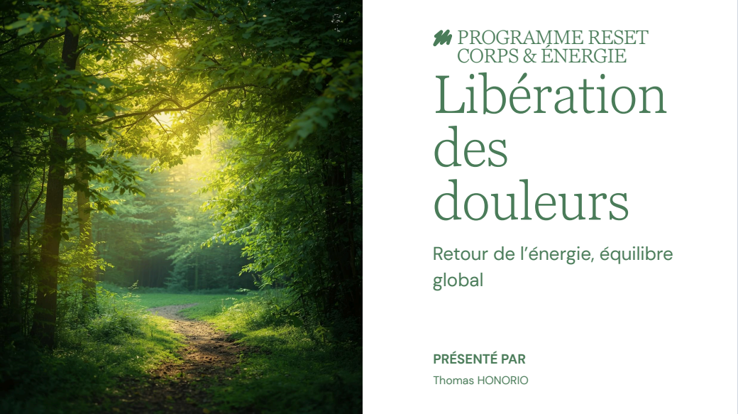 Le programme RESET Corps & Énergie est un accompagnement holistique de 8 semaines conçu pour agir à la source des douleurs chroniques, restaurer l’équilibre du corps et relancer durablement l’énergie vitale.